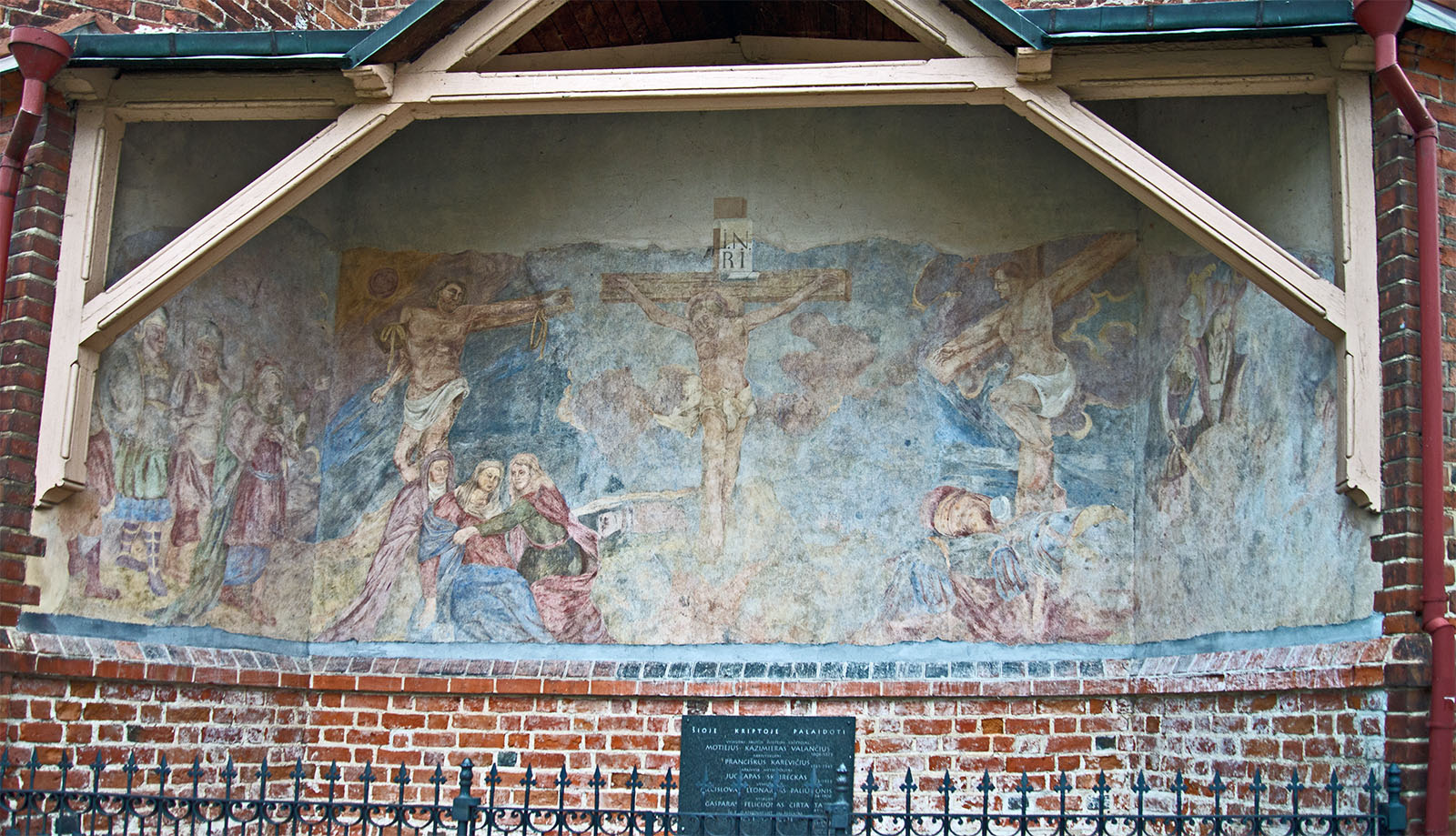 旧市庁舎広場にたつ十字架 特徴的なデザインがリトアニアの伝統