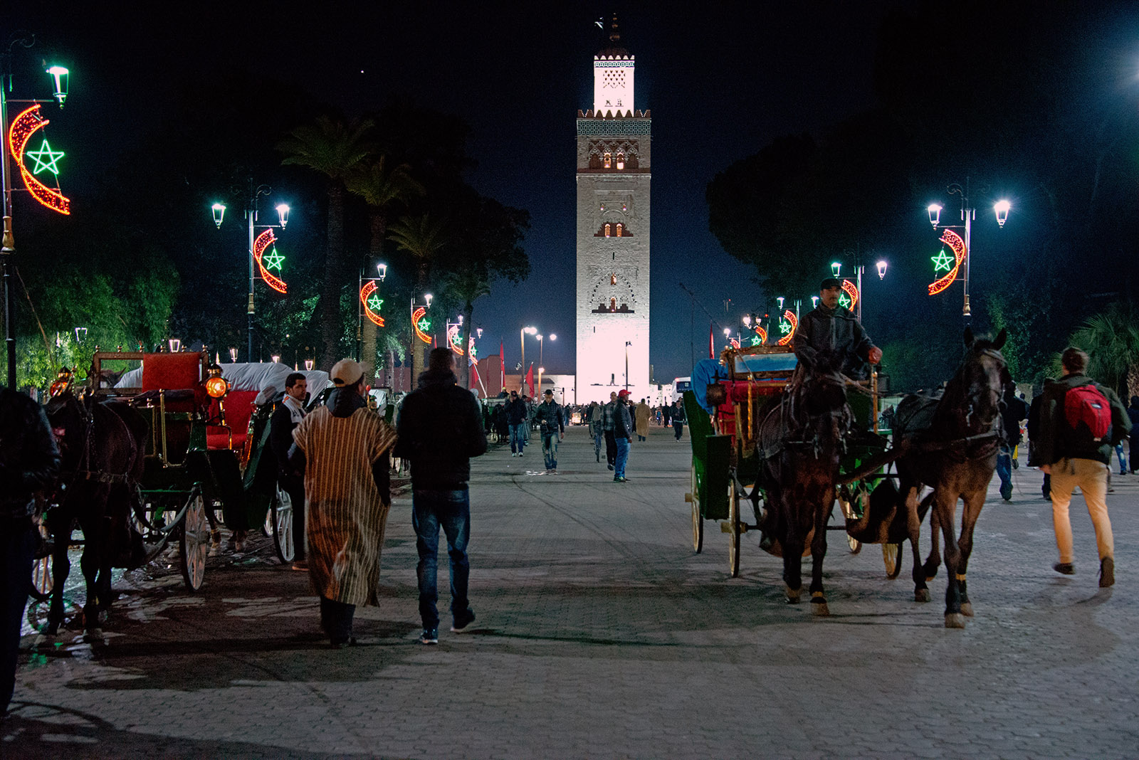 11世紀後半、モロッコ中央部に位置するマラケシュがイスラム王朝の都であった頃から、街の中心にあるジャマ・エル・フナ広場が活気に満ちていた。城壁に囲まれた旧市街地の中心にあり、約400m四方の世界最大の広場とも言われる。夜には大道芸人が技を競う姿や、猿や蛇を扱う者などの様々な芸を楽しむことができる。また、レストランやオレンジジュース屋台などで食も堪能できる。まさに毎日がお祭り騒ぎの広場。ちなみに、ジャマ・エル・フナ (Djemaa el Fna) とは、アラビア語で死人の集会場の意味だそうです。