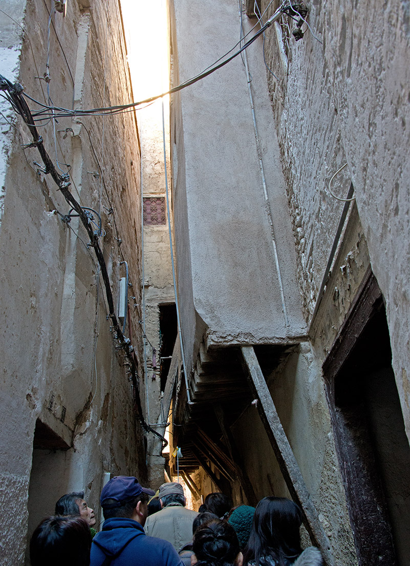 ブー・ジュルード門を通ってフェズ旧市街に足を踏み入れる。モロッコ中北部のなだらかな起伏の丘に、9世紀初頭に開かれたイスラム王朝の古い都フェス。フェス・エル・バリと呼ばれる旧市街(メディナ)には建物がひしめき、人がすれ違うのがやっとの狭い路地が無秩序に延びています。常に外敵の侵略にさらされてきた地中海沿岸地域では、周囲に堅固な城壁を巡らせ、内部を複雑な構造にした都市が発達しました。中でもフェス旧市街は巨大迷路で、「世界一の迷宮都市」と形容されるほどです。