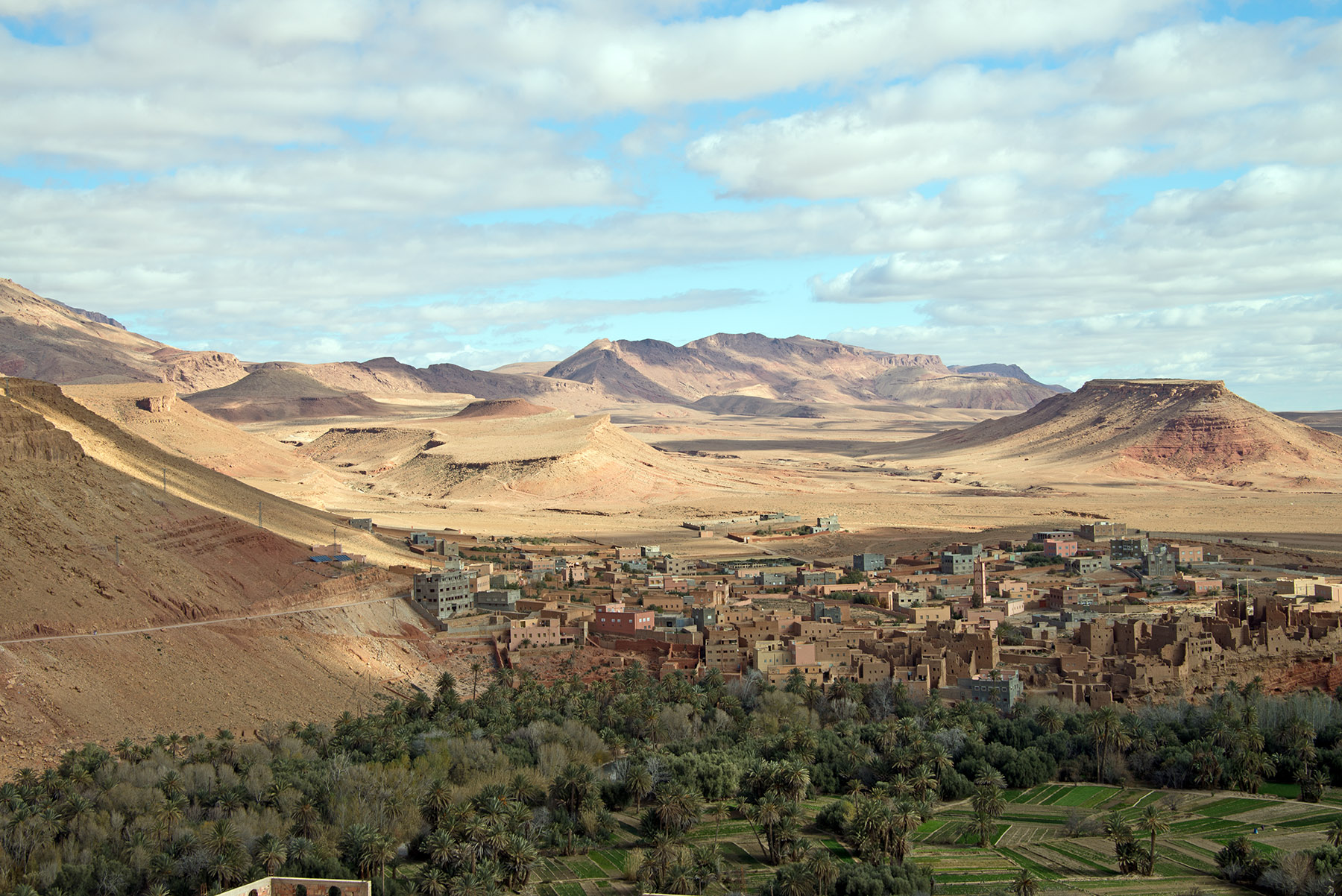 カスバ街道は、アトラス山脈南部の砂漠地帯には、ワルザザードからティネリール(トドラ峡谷)を経て、エルラシディアを結ぶ道。かつて隊商交易が陸上交通の要所として通っていました。カスバとは外敵から守る城壁に囲まれた要塞のこと。街道沿いにはカスバやオアシス、峡谷が点在する。サハラ砂漠の入り口を東西に結ぶカスバ街道沿いには、映画のロケ地、世界遺産、断崖絶壁の景勝地など見どころが集中しています。そして、カスバ街道の終点地から西は、サハラ砂漠が広がっています。