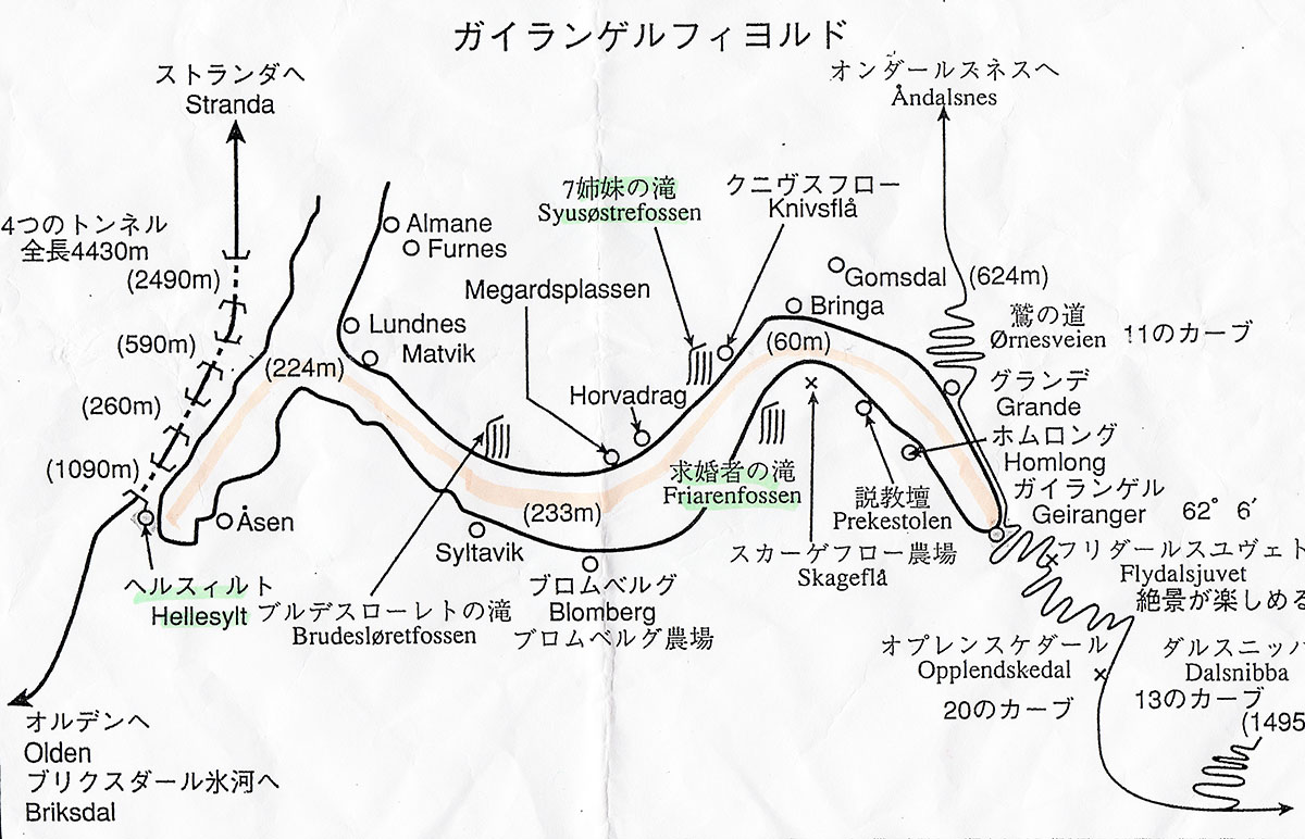 ガイランゲル~ヘルシルト間のクルーズは、フェリーで約1時間の旅です。山頂に氷河を抱く山々や、標高1200~1500mの切り立った断崖絶壁が両側に迫る。断崖絶壁の岩肌を流れ落ちるのは、繊細な流れの「花嫁のベール」あるいは「七人姉妹」と呼ばれる7筋の滝、酒瓶の形のような「求婚者の滝」など数々の滝がある。