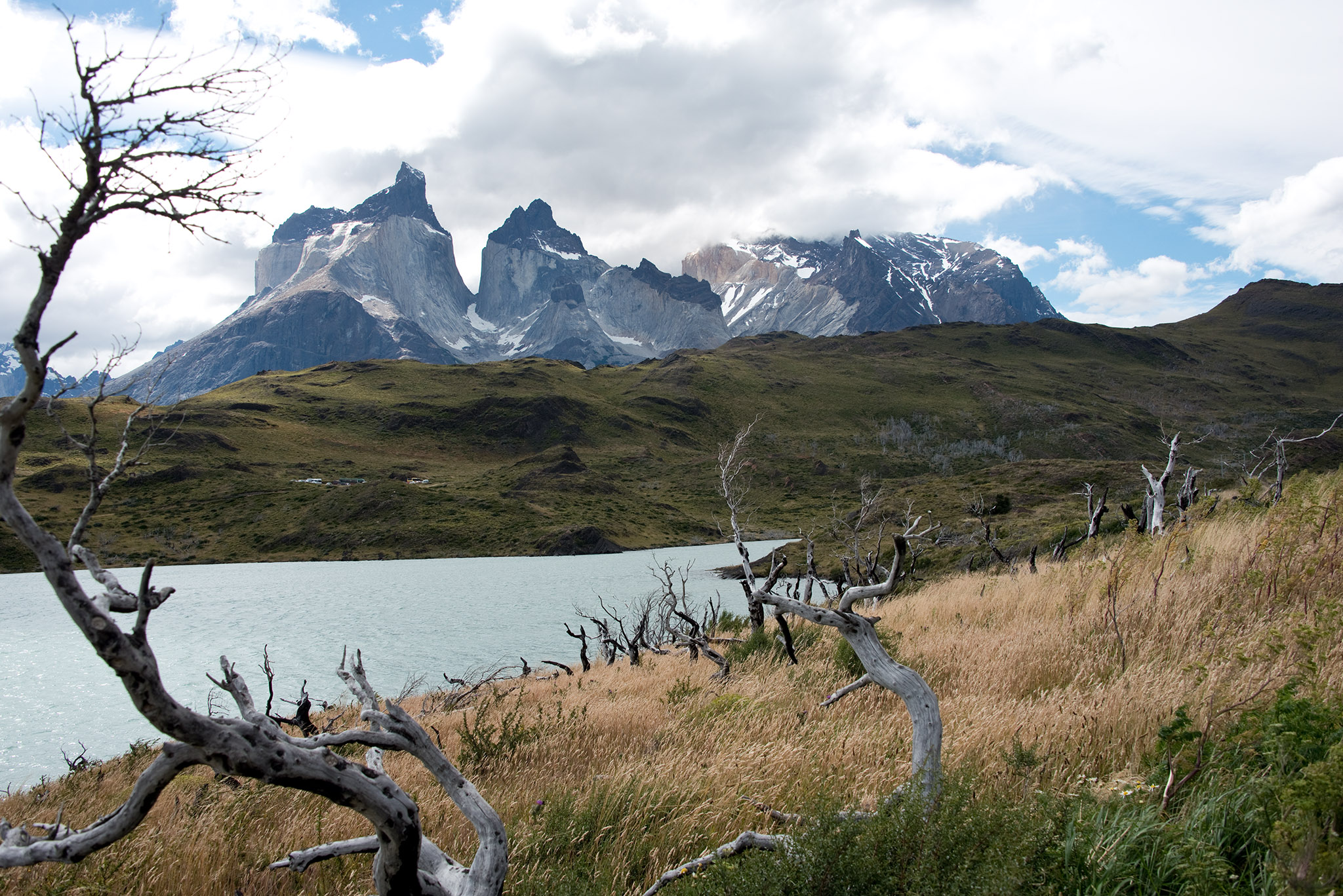 ペオエ湖の対岸から見たパイネ大滝(サルト・パイネ)とパイネ・グランデ