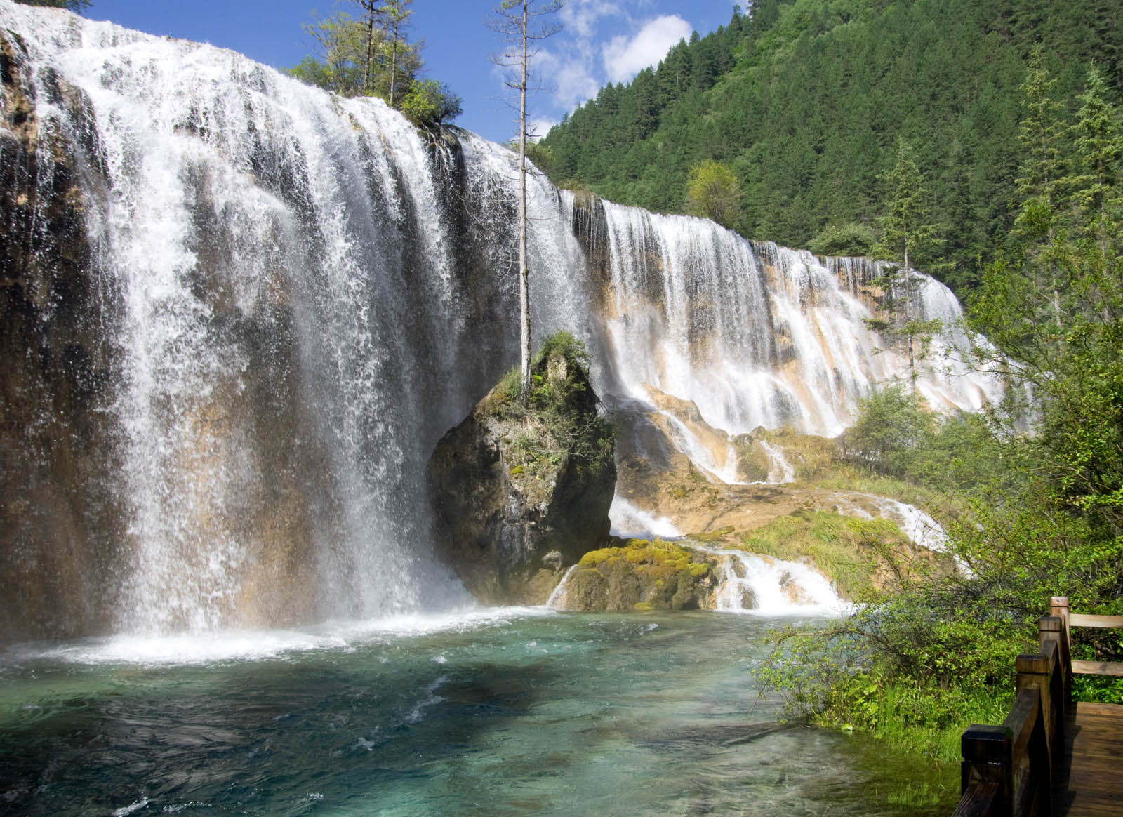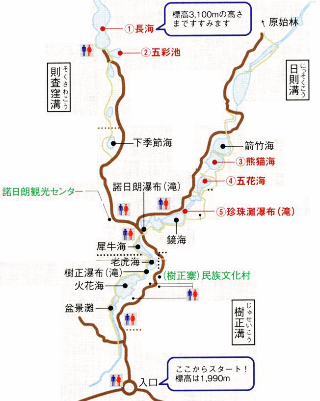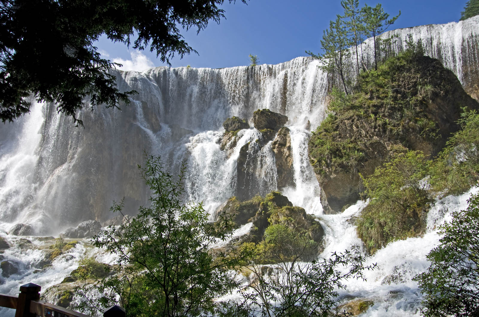 Y字型の九寨溝の流れの中心部にある 350mの幅を持つ滝 標高2365mのにあり、幅270mと中国一を誇ります。落差は20mあり、中国最大級の石灰岩滝です。  諾日朗はチベット語で「ノリラン」と読み、壮大かつ雄大な「男神」を意味し、ダイナミックなその勢いから名づけられました。上流の諾日朗池群から流れて出た水は滝となり、銀河のように流れ落ちます。岩を打つ音が轟きわたり、谷を震わせます。特に南側は水の勢いが激しく霧のような水しぶきが冷感を与えます。朝日に照らされると何本もの虹がかかり、絶景を堪能できます。
