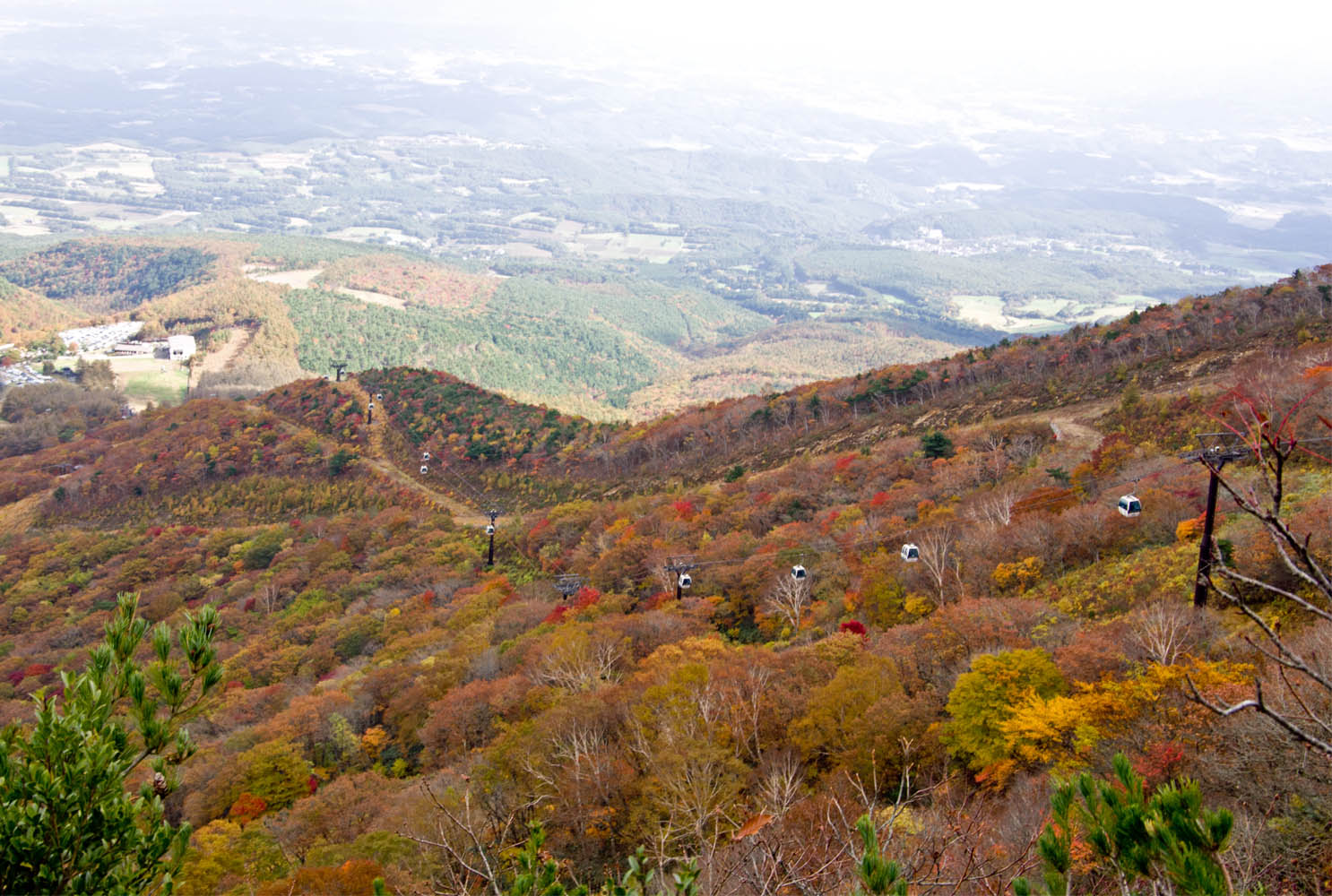 ![]() 薬師岳展望台(ロープウエイの山頂駅)からの安達太良山 中腹の紅葉が盛り |