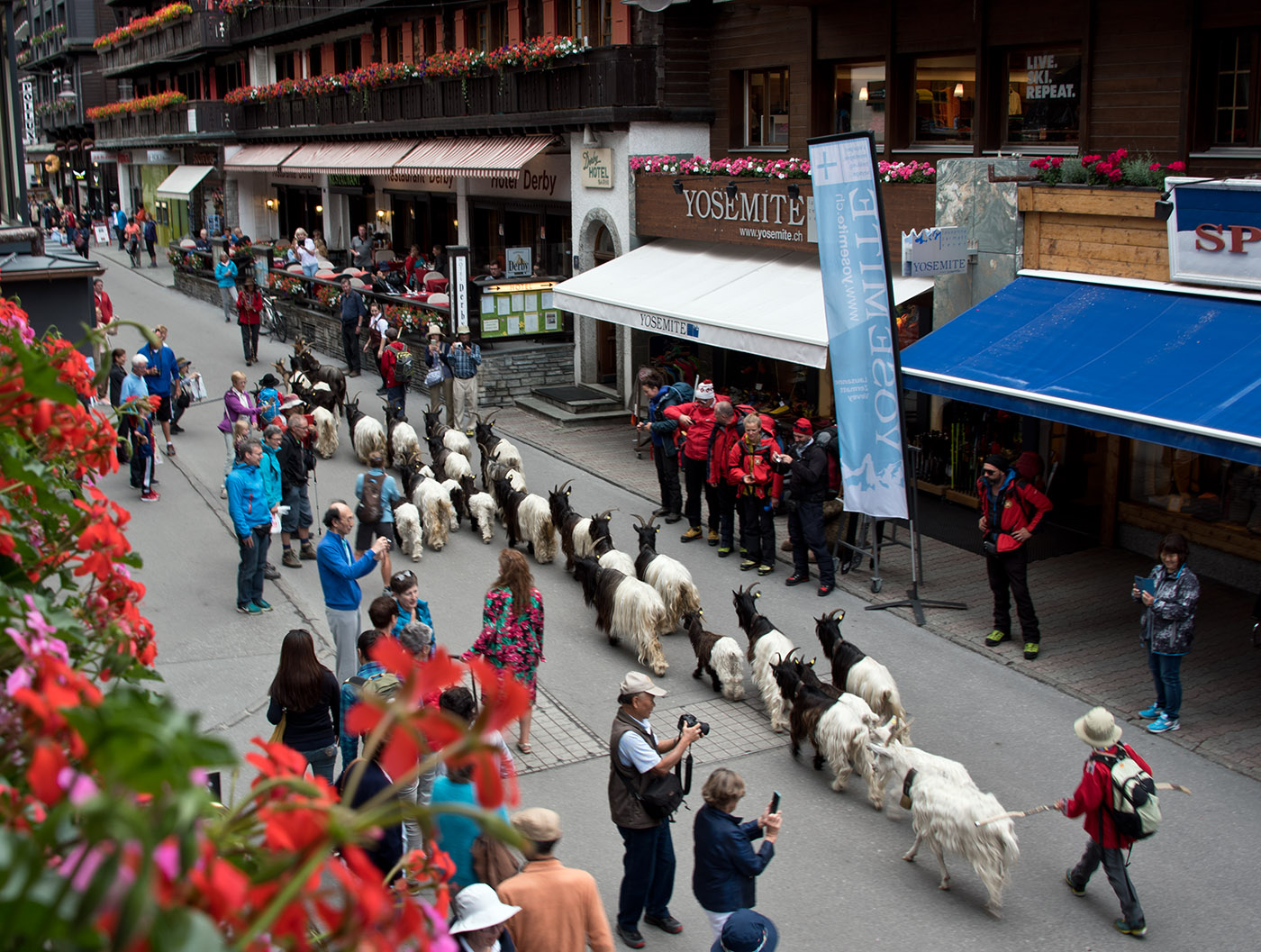 ローテンボーデンで登山電車を下車し、リフェル湖で水面に映るマッタホルンなど峰峰を眺め、高山の花花を楽しみながら、リッフェルべルグ駅まで下る。(約1時間30分の緩やかな下り)一面に咲いている花を踏まないように注意して歩く。アルパイン・マーモットの生息地を下るが、出会うことはなかった。
